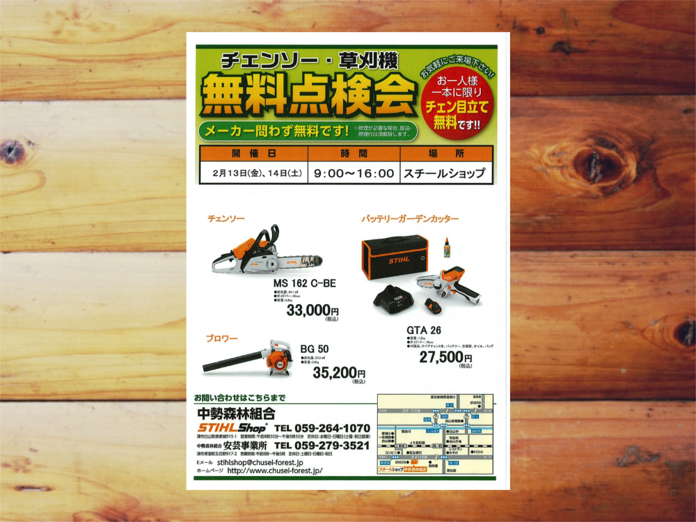 2月13日(金)、14日(土)の2日間、スチールショップにて無料点検会を開催します。 チェンソー・草刈機等機械...