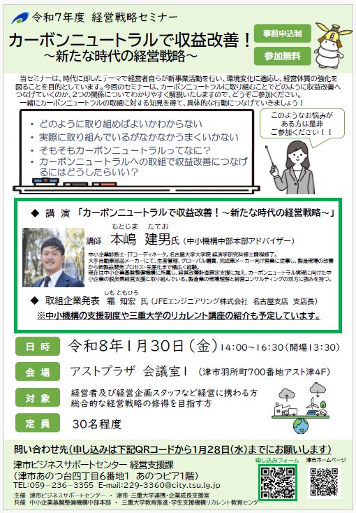 三重県津市様主催の「経営戦略セミナーカーボンニュートラルで収益改善~新たな時代の経営戦略~」に参加しました。